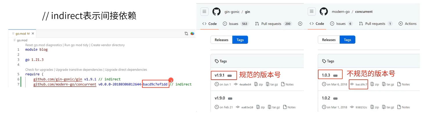 没有语义版本时会生成一个伪版本,例如v0.0.0-20180306012644-bacd9c7efldd,第二部分表示代码生成的时间,第三部分是commit的前12个字符。