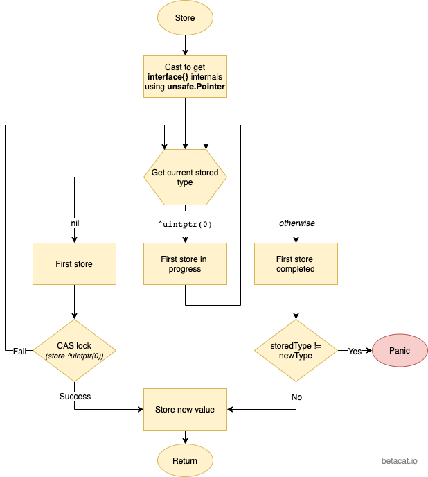 v.Store(c)- 写操作,将原始的变量c存放到一个atomic.Value类型的v里。c = v.Load()- 读操作,从线程安全的v中读取上一步存放的内容。
