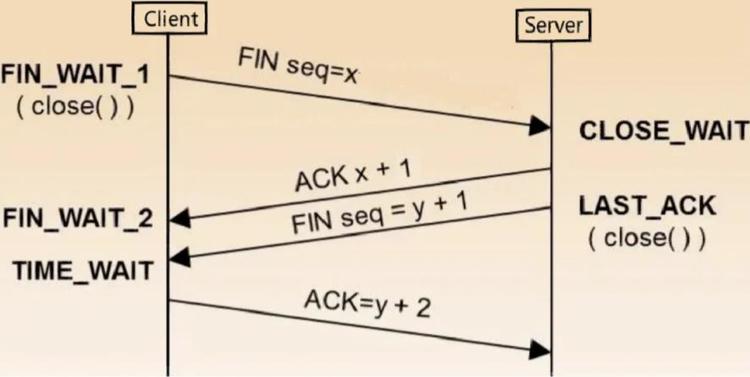 4、客户端收到FIN报文后,发出ACK报文进行应答,并把服务端的序列号值+1作为ACK报文序列号(seq=y+2)。此时客户端进入TIME-WAIT状态。服务端在收到客户端的ACK 报文后进入CLOSE 状态。如果客户端等待2MSL没有收到回复,才关闭连接。