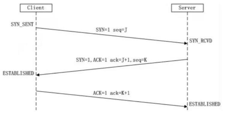 (一)三次握手的过程如下: 1、客户端向服务器发送SYN报文、初始化序列号ISN(seq=x),然后客户端进入SYN_SEND状态,等待服务器确认。 2、服务端发送ACK确认服务端的SYN报文(ack=x+1),同时发出一个SYN报文,带上自己的初始化序列号(seq=y),然后服务端进入SYN_RECV状态。 3、客户端接收到服务端的SYN、ACK报文,ACK确认服务端的SYNC报文(ACK=y+1),然后客户端和服务器端都进入ESTABLISHED状态,完成TCP三次握手。 (二)为什么不是四次握手? 因为传输效率不够高。 (三)为什么不能两次握手? 两次握手无法让通信双方数据原点的序列号一致,不能保证数据可靠传输。