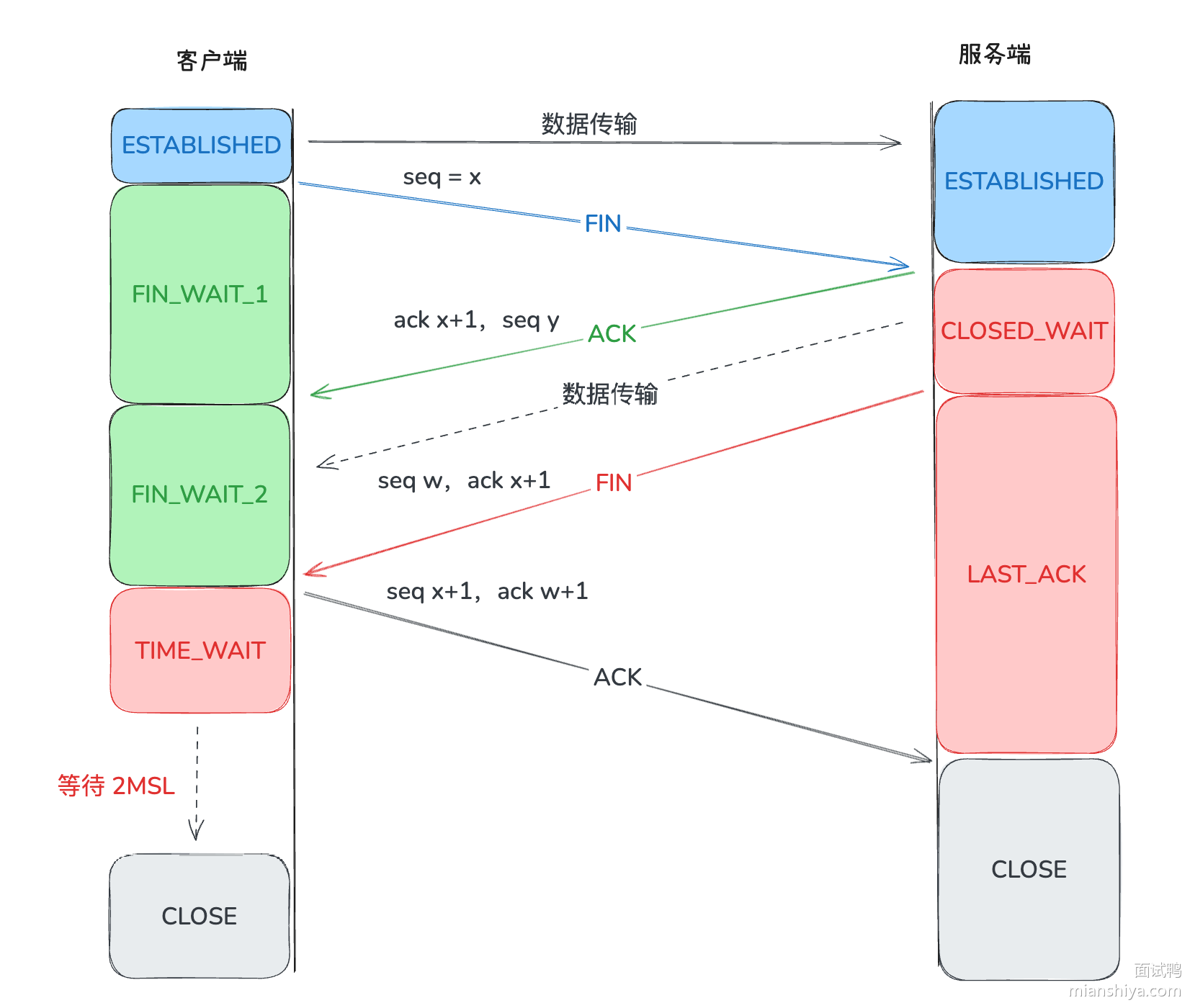 - 在连接关闭后,主动关闭的一方会进入 TIME_WAIT 状态,等待一段时间以确保所有数据段都被正确处理,避免旧数据干扰新连接。