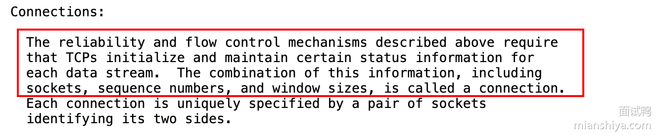 根据 RFC793 定义,TCP 的连接就是:TCP 为每个数据流初始化并维护的某些状态信息(这些信息包括 socket、序列号和窗口大小),称为连接。