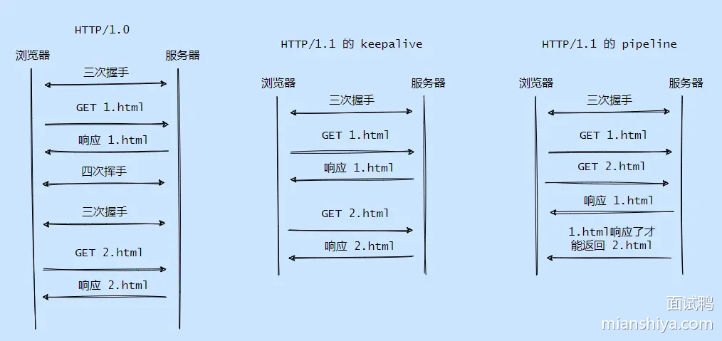 - 支持 pipeline,无需等待前面的请求响应,即可发送第二次请求。