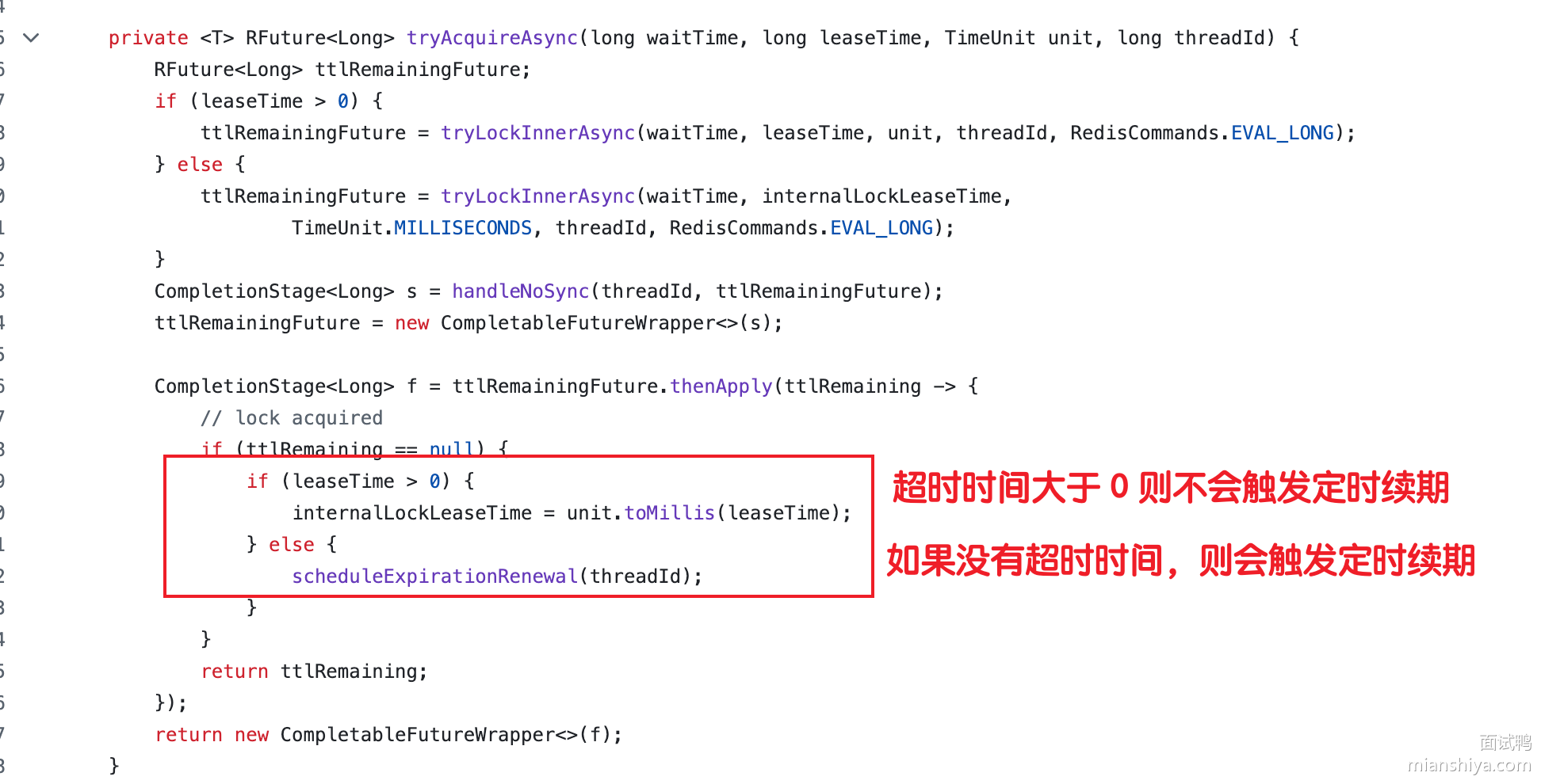 我们看下 redisson 加锁方法,例如 tryLock,实际会触发 tryAcquireAsync 方法,而里面会有对 leaseTime 的判断: