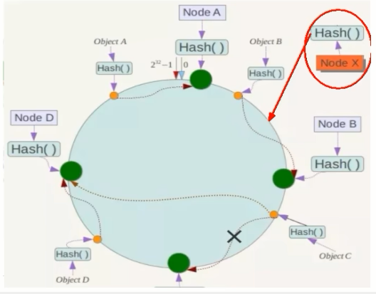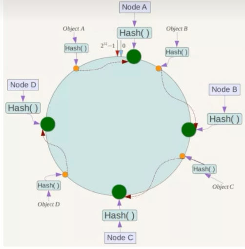 如我们有 Object A、 Object B、 Object C、 Object D 四个数据对象,经过哈希计算后,在环空间上的位置如下:根据一致性 Hash 算法,数据 A 会被定为到 Node A 上,B 被定为到 Node B 上,C 被定为到 Node C 上,D 被定为到 Node D 上。