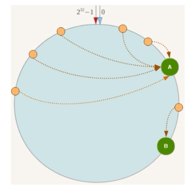 当我们需要存储一个 kv 键值对时,首先计算 key 的 hash 值,hash (key),将这个 key 使用相同的函数 Hash 计算出哈希值并确定此数据在环上的位置,从此位置沿环顺时针 “行走”,第一台遇到的服务器就是其应该定位到的服务器,并将该键值对存储在该节点上。