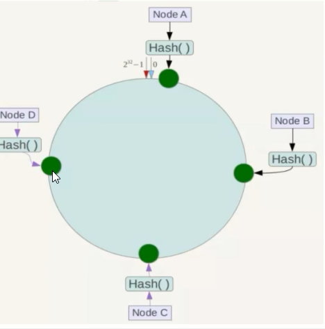 将各个服务器使用 Hash 进行一个哈希,具体可以选择服务器的 IP 或主机名作为关键字进行哈希,这样每台机器就能确定其在哈希环上的位置。假如 4 个节点 NodeA、B、C、D,经过 IP 地址的 哈希函数 计算 (hash (ip)),使用 IP 地址哈希后在环空间的位置如下: