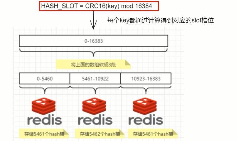 Redis 集群有 16384 个哈希槽每个 key 通过 CRC16 校验后对 16384 取模来决定放置哪个槽,集群的每个节点负责一部分 hash 槽,举个例子,比如当前集群有 3 个节点,那么: