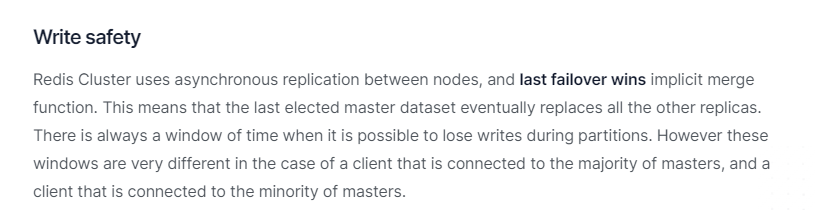 redis 集群不保证强一致性,这意味着在特定的条件下,Redis 集群可能会丢掉一些被系统收到的写入请求命令。