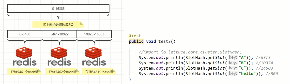 Redis 集群中内置了 16384 个哈希槽,redis 会根据节点数量大致均等的将哈希槽映射到不同的节点。当需要在 Redis 集群中放置 一个 key-value 时, redis 先对 key 使用 crc16 算法算出一个结果然后用结果对 16384 求余数 [ CRC16 (key) % 16384], 这样每个 key 都会对应一个编号在 0-16383 之间的哈希槽,也就是映射到某个节点上。如下代码,key 之 A、B 在 Node2, key 之 C 落在 Node3 上