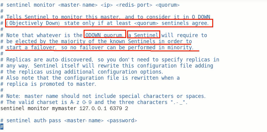 <quorum>:指定用于进行故障检测和故障转移的投票数。在哨兵集合中,必须有超过quorum个哨兵认为主节点不可用时,才会执行故障转移。这有助于避免误报和错误的故障转移。quorum 表示最少有几个哨兵认可客观下线,同意故障迁移的法定票数。