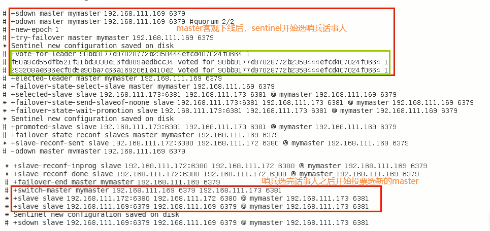 Master-Slave 切换后,master_redis.conf、slave_redis.conf 和 sentinel.conf 的内容都会发生改变,sentinel.conf 的监控目标会随之调换。