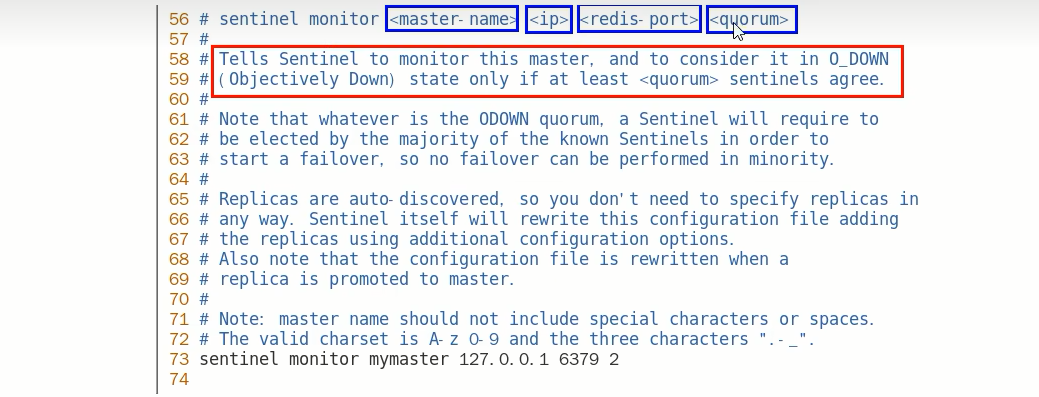 <master-name>:指定要监视的 Redis 主节点的名称。这个名称在整个哨兵集群中必须是唯一的,并且在配置其他哨兵、执行故障转移等操作时会使用到。 -